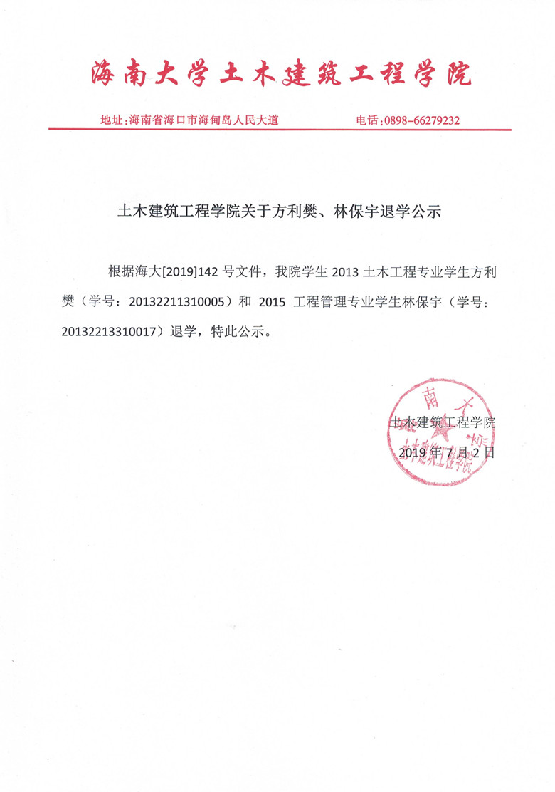 德赢vwin官方入口关于方利樊、林保宇退学的公示