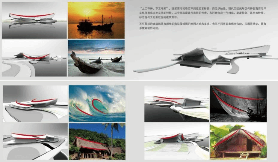上午10点,师生们准时抵达南海博物馆所在位置——潭门渔港。阳光下,远远映入眼帘的是博物馆流畅舒展的曲线姿态,银色屋面如海浪翻涌,又如渔网轻扬,与远处的碧海蓝天浑然一体。在后来的讲座上,夏桂平老师以“上工守神,下工守形”为切入点,向同学们阐释了该博物馆的设计理念:“建筑不追求形似渔船或民居,而是通过抽象语言传递南海文化的魂魄。”许多同学举起相机,试图捕捉建筑轮廓中若隐若现的“海船龙骨”“礁石肌理”等意象,感受设计者对海洋文化的诗意转译。