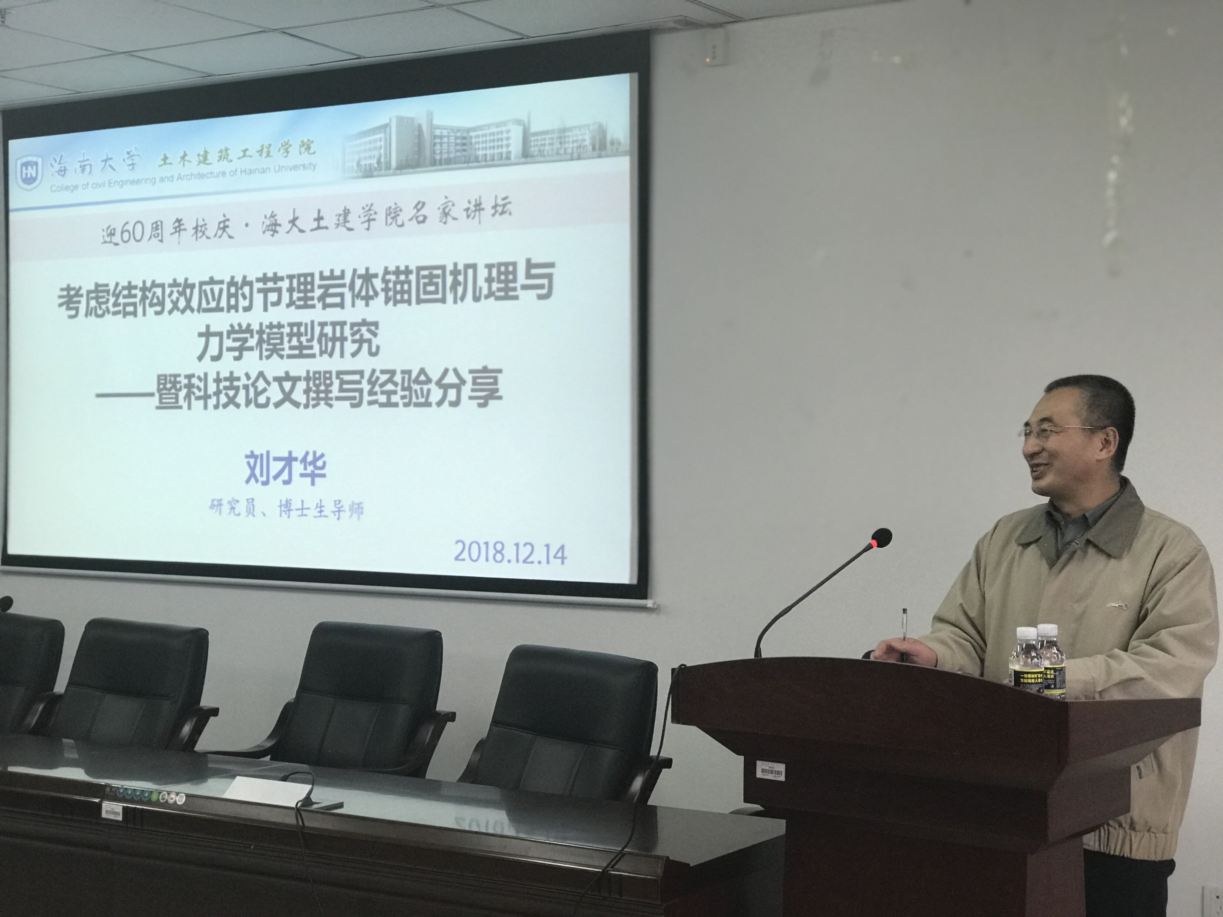 2018年12月14日下午3点,值德赢AC米兰官网迎60周年校庆之际,德赢官网邀请中国科学院武汉岩土力学研究所刘才华研究员为德赢官网师生作学术报告,报告题目为《考虑结构效应的节理岩体锚固机理与力学模型研究——暨学术论文撰写经验分享》。讲座由学院院长曹宝珠教授主持,学院张友良教授、岩土工程教研室全体教师、全体研究生及部分保研本科生参加了本次学术活动。