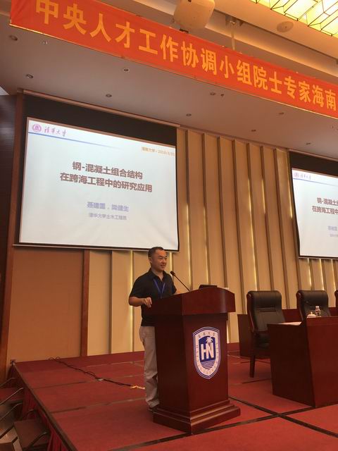 樊健生教授作“组合结构在跨海工程中的研究应用”主题报告。樊教授首先介绍了组合结构的基本特征和建材优势,然后分别从海洋工程对组合结构的需求、钢板-混凝土组合墙、钢板-混凝土隧道三个方面报告了组合结构在复杂大型工程中的应用。