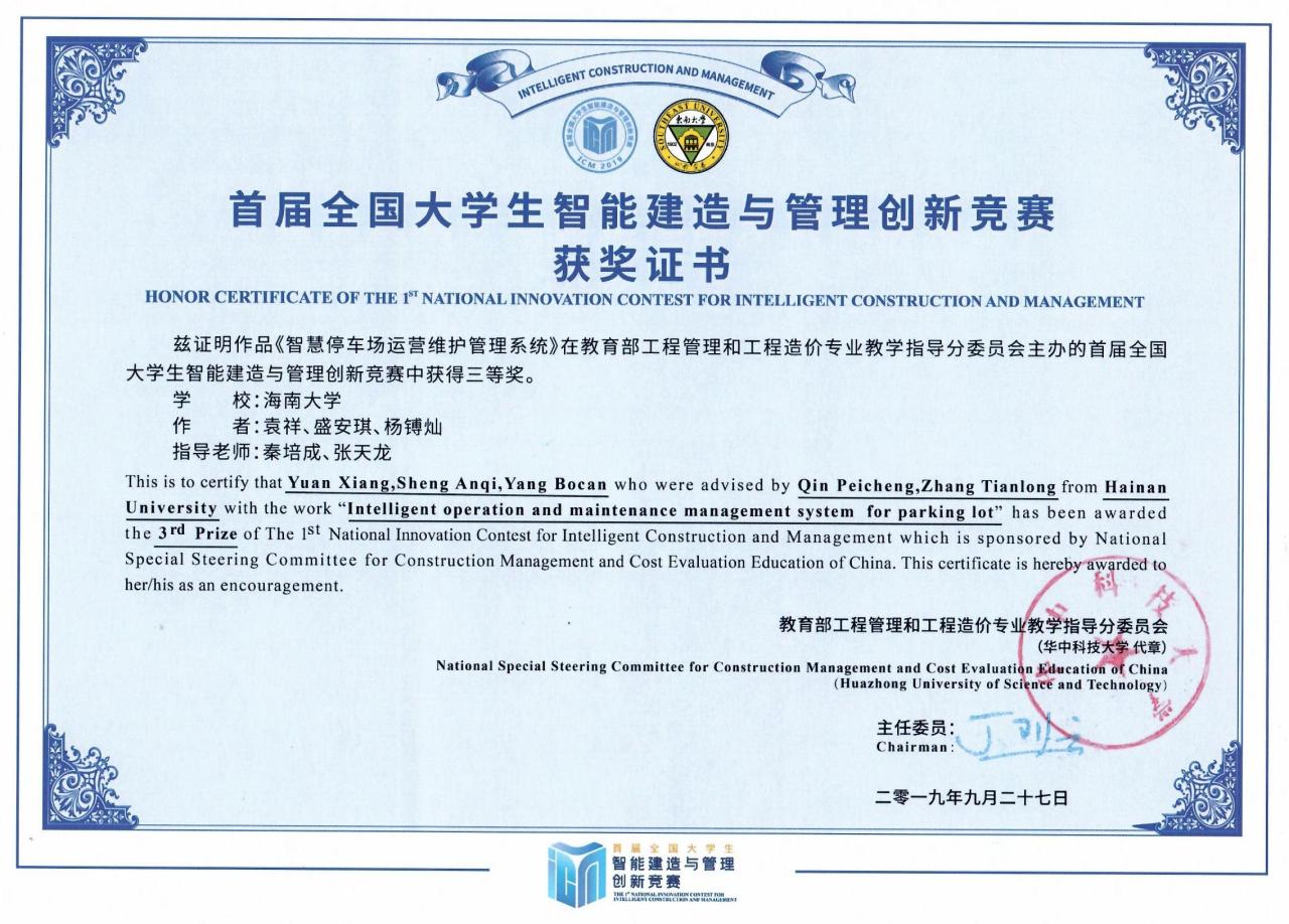 首届全国大学生智能建造与管理创新竞赛于2019年9月14日至9月15日在东南大学举办,德赢官网和计算机与网络空间安全学院跨学科跨专业联合组队,经过提交作品、现场答辩和专家评审等环节代表队荣获三等奖。参赛学生队员分别为2016级工程管理专业袁祥、盛安琪同学及2016级计算机科学与技术专业杨镈灿同学,指导教师为德赢vwin官方入口工程管理系秦培成老师和张天龙老师。