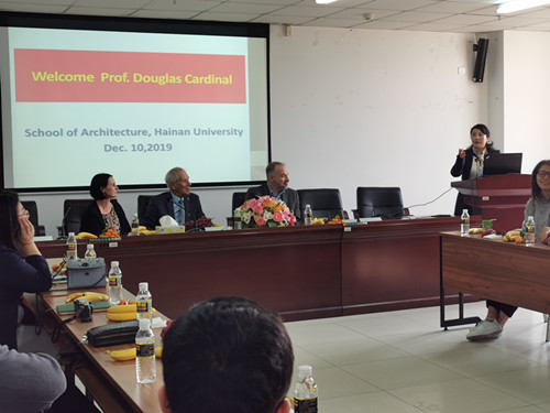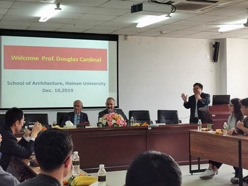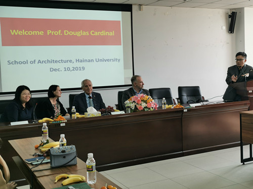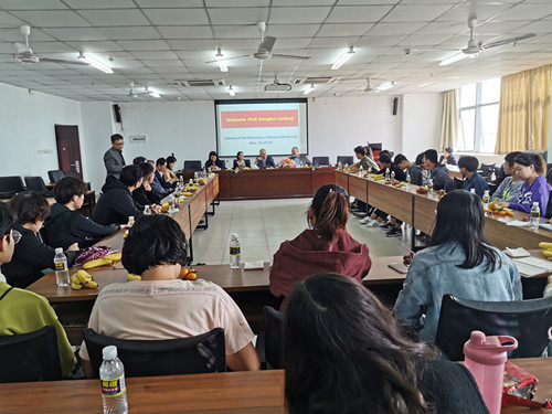 2019年12月10日上午,研发楼510报告厅,建筑系师生齐聚一堂,热情洋溢地同加拿大知名建筑师道格拉斯先生、道格拉斯夫人以及助理马克先生等3人一行举行了一场精彩的茶话座谈会。座谈会由建筑系张华立老师主持,德赢vwin官方入口周智院长致欢迎词,建筑系系主任夏桂平向道格拉斯先生一行介绍了建筑系的办学情况,并期待道格拉斯先生大力支持建筑系办学并展望国际合作未来。座谈会上,道格拉斯先生优雅而坦诚地介绍了他个人的创作理念和设计手法,并向师生们展示讲解了大量他个人的设计建成作品。有机而灵动的作创思路并结合在地自然环境和人文环境,道格拉斯每一个作品都深深地吸引并打动了在场的每一位师生。座谈期间,老师和同学们热切地同道格拉斯先生互动交流,在有限的两个小时内,期望向道格拉斯先生学到更多的设计与创作智慧。