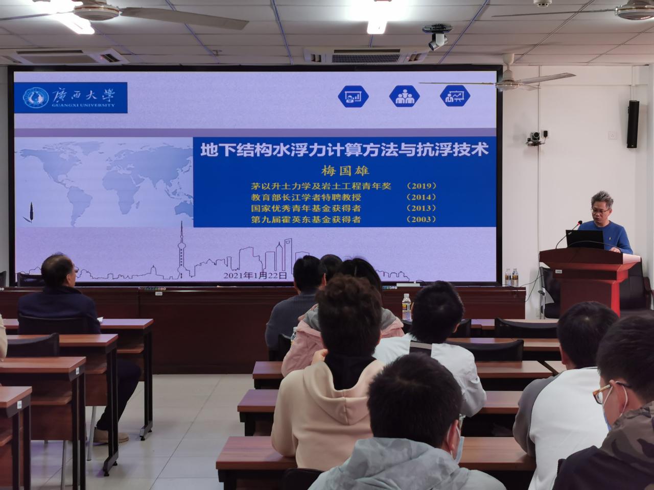 2021年1月22(周五)下午2:00-3:00点广西大学工程防灾与结构安全教育部重点实验室主任梅国雄应德赢官网周智院长的邀请,在德赢AC米兰官网研发楼510报告厅做《地下结构水浮力计算与抗浮关键技术》学术报告。报告会由张友良副院长主持,我院教师和研究生近30人参加了此次学术报告会。