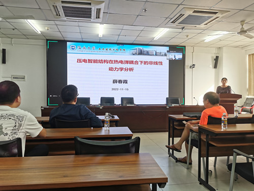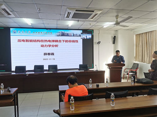 11月15日下午16:00-17:00,德赢官网教师薛春霞教授(2021年10月份入职)在研发楼510做了题为《压电智能结构在热电弹耦合下的非线性动力学分析》的学术报告,会议采用线上、线下相结合的方式进行。学术报告会由辛大波教授主持,他介绍了德赢官网新入职教师系列学术报告活动安排,并介绍了本次报告人薛春霞教授的科研成果相关情况。学院教师、研究生50余人通过现场和腾讯会议聆听了报告会。