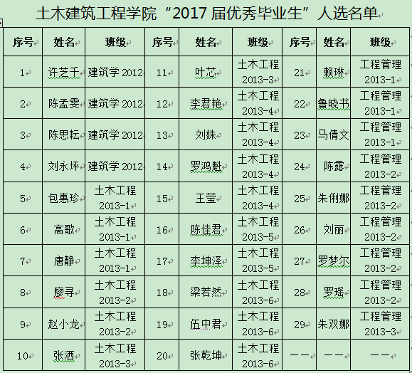 根据学校相关通知要求及《德赢AC米兰官网“三好学生”“优秀学生干部”“优秀毕业生”“最具创新精神和实践能力的大学生”评选实施细则》相关规定,经班级推荐,学院审核,拟推荐鲁晓书等29人为上报学校的“2017届优秀毕业生”人选,现予以公示。公示期为:2017年5月31日—2017年6月2日。在公示期内,如有异议,请于2017年6月2日17:40前向学工办(研发楼319室)提出。