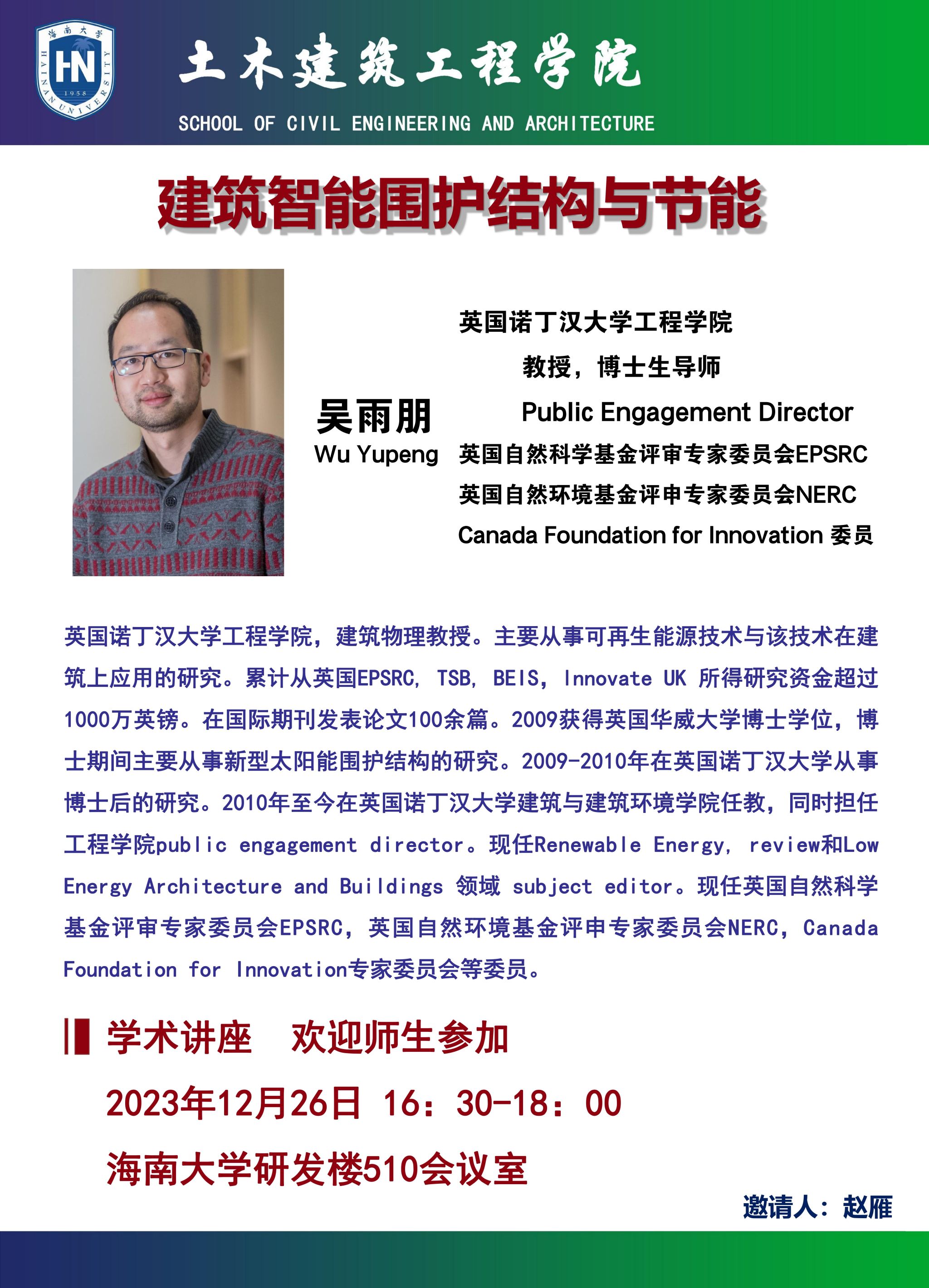 12月26日(周二)16:30-18:00在德赢AC米兰官网研发楼510会议室,英国诺丁汉大学工程学院教授,博士生导师 Public Engagement Director(英国自然科学基金评审专家委员会EPSRC、英国自然环境基金评申专家委员会NERC、Canada Foundation for Innovation 委员),在德赢官网做《建筑智能围护结构与节能》学术报告。欢迎有兴趣的师生参加。