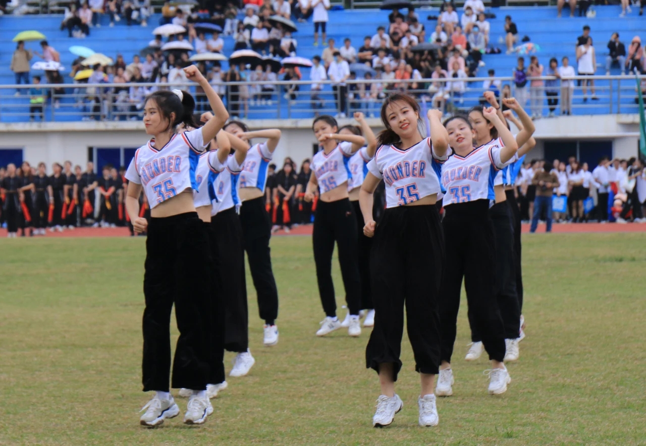 虽然天气阴沉,但现场同学们依然热情高涨,共同期待着本届运动会的召开。在开幕式准备期间,田径场就已被同学们的热情所充满。开幕式正式开始后,慷慨激昂的运动会进行曲在操场上回荡。首先入场的是各个学院的方阵,在音乐声的笼罩下,一个个学院方队排着整齐的队形,神采飞扬,昂首阔步地向主席台走来。独具特色的学院服装和风格展现出了他们的朝气与活力。他们朝气蓬勃,整齐划一,充分彰显了大学生团结自强、拼搏呐喊,积极向上的精神风貌。