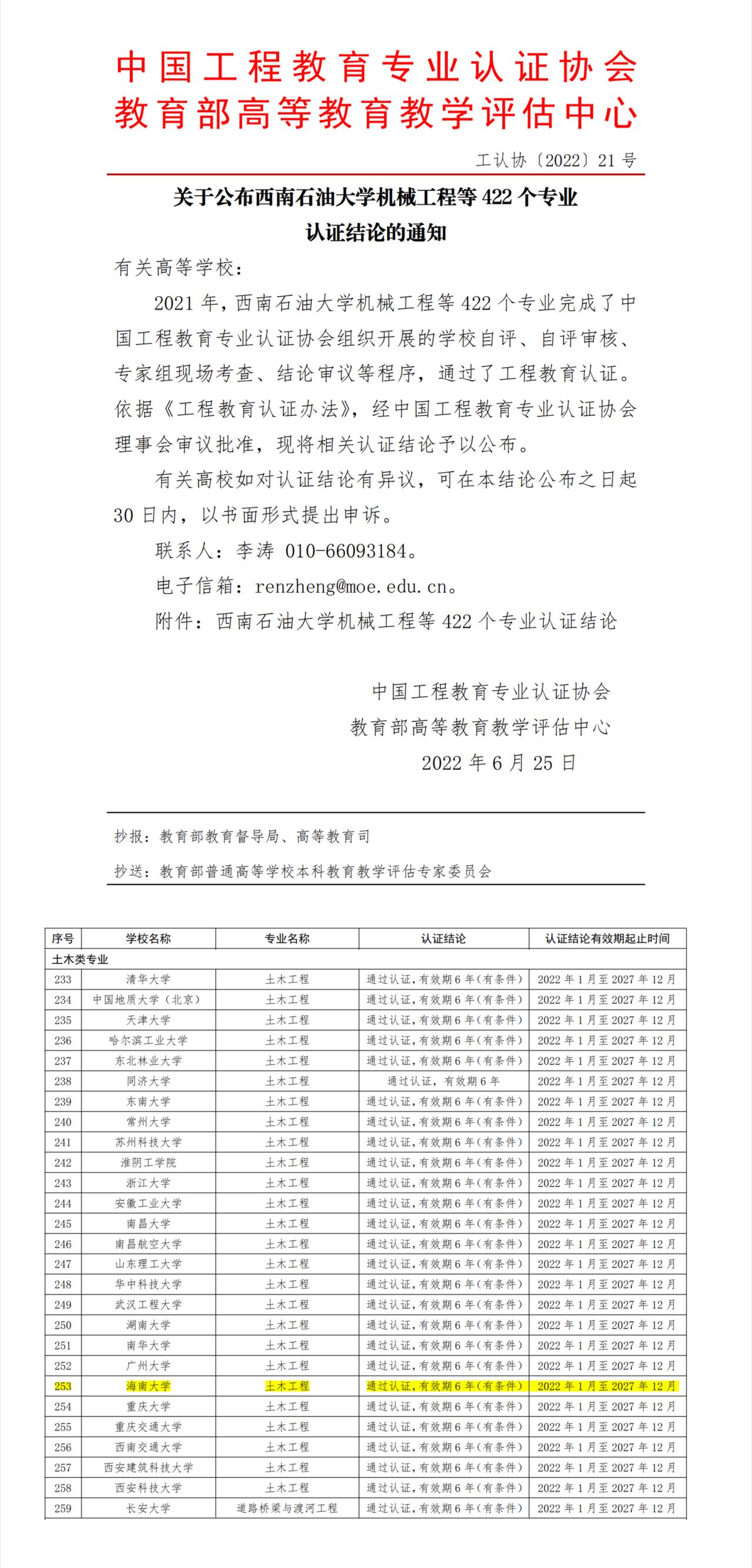 20226月25日,中国工程教育专业认证协会、教育部高等教育教学评估中心发布《关于公布西南石油大学机械工程等422个专业认证结论的通知》(工认协[2022]21号)。德赢AC米兰官网土木工程专业顺利通过工程教育认证,认证结论为“通过认证,有效期6年(有条件)”,认证结论有效期起止时间为20221月至202712月。同时通过认证的有清华大学、同济大学和浙江大学等26所高校的土木工程专业。据悉,该名单还将提交至国际工程教育《华盛顿协议》组织。