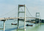 悬索桥具有用料省、自重轻跨越能力大、造型优美、宏伟壮观等特点。悬索桥跨径可达1000米以上,目前世界上悬索桥跨径最大接近2000米。因此,悬索桥在世界上有“桥梁皇后”之称。其弱点刚度较小,抗风能力较差,设计时必须在刚度和抗风能力上予以保证。