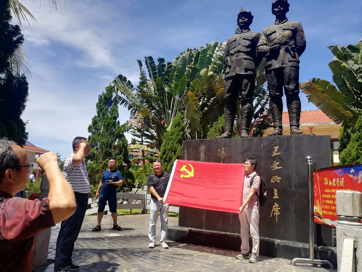 “我志愿加入中国共产党,拥护党的纲领,遵守党的章程……”在琼崖革命主要领导人王文明和冯白驹的雕像下,两个教工支部党员在学院党委卢江海书记的带领下重温入党誓词。